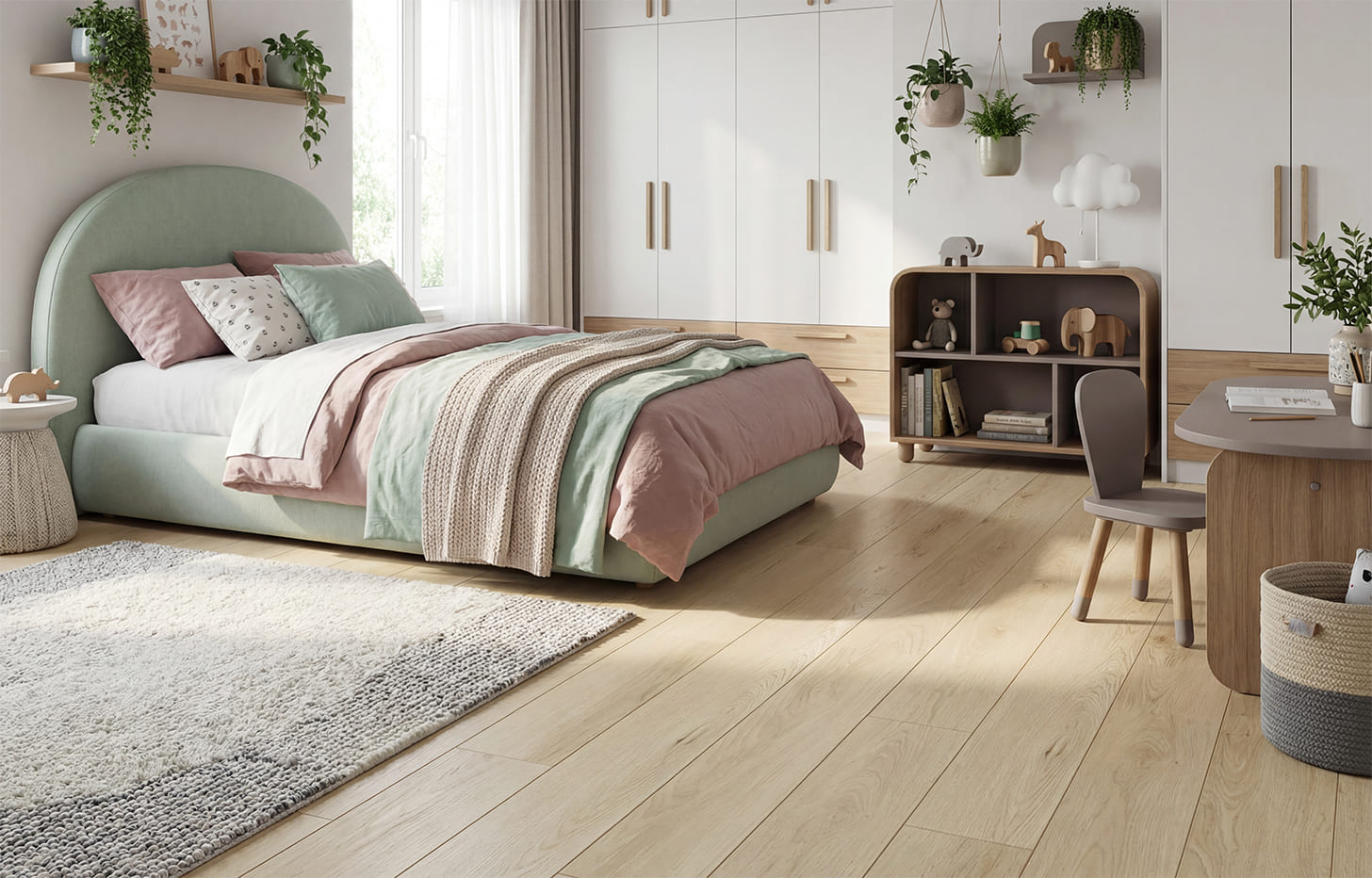 Адреса магазиновМинерально-каменный ламинат Дуб Кловерфилд имеет светло-песочные оттенки, отсылая вас к интерьеру в природных ландшафтных цветах. Неширокий изящный формат ламели с 4-сторонней фаской будет наполнять помещение мягким светом, не заполняя его, а раскрывая. Такие оттенки пола модно использовать для так называемого «дофаминового стиля», так как Дуб Кловерфилд отлично сочетается с пастельными оттенками зеленого, белого, припыленного розового. Но если вы захотите добавить помещению серьезных акцентов, то достаточно холодных оттенков серого и коричневого, которые нейтрализуют песочный, добавив баланса.